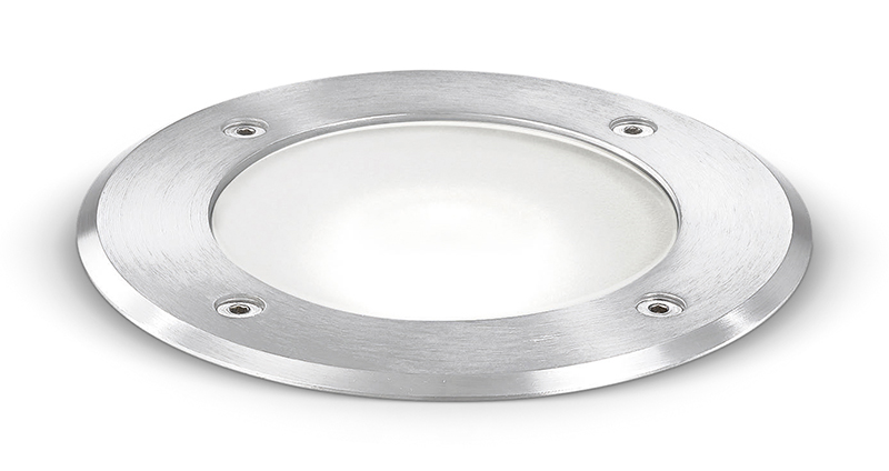 Faretto da incasso calpestabile e orientabile. Struttura in alluminio. Cover in acciaio inossidabile AISI 306. Diffusore in vetro trasparente temperato. Controcassa inclusa.