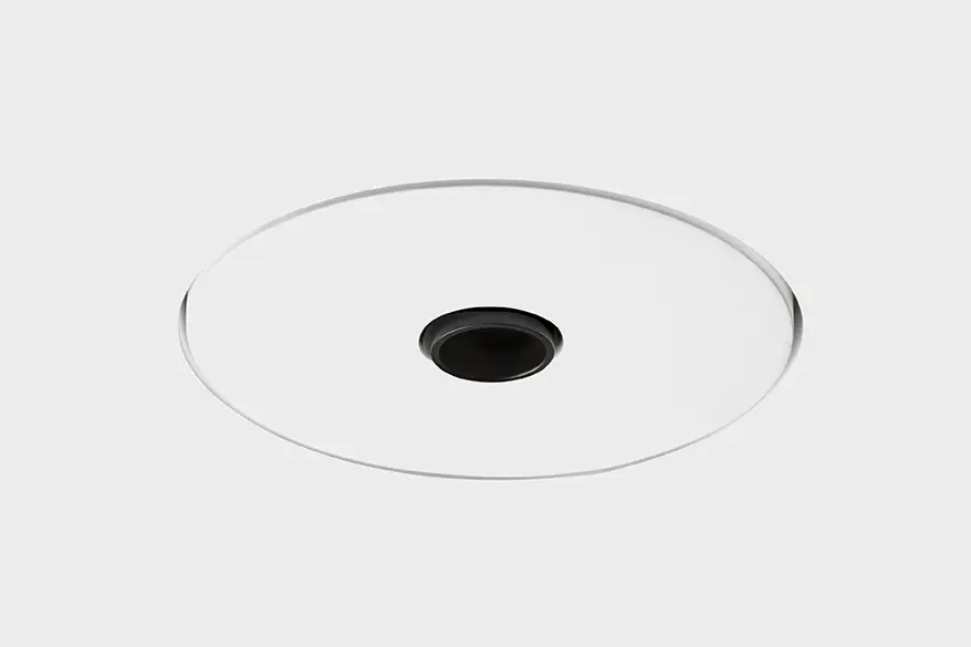 Faretto da incasso in gesso con anello in alluminio verniciato nero. Diametro punto luce 20 mm con modulo led integrato e alimentatore a bordo. Il faretto, installabile nel cartongesso, una volta rasato risulta parte unica con la struttura.