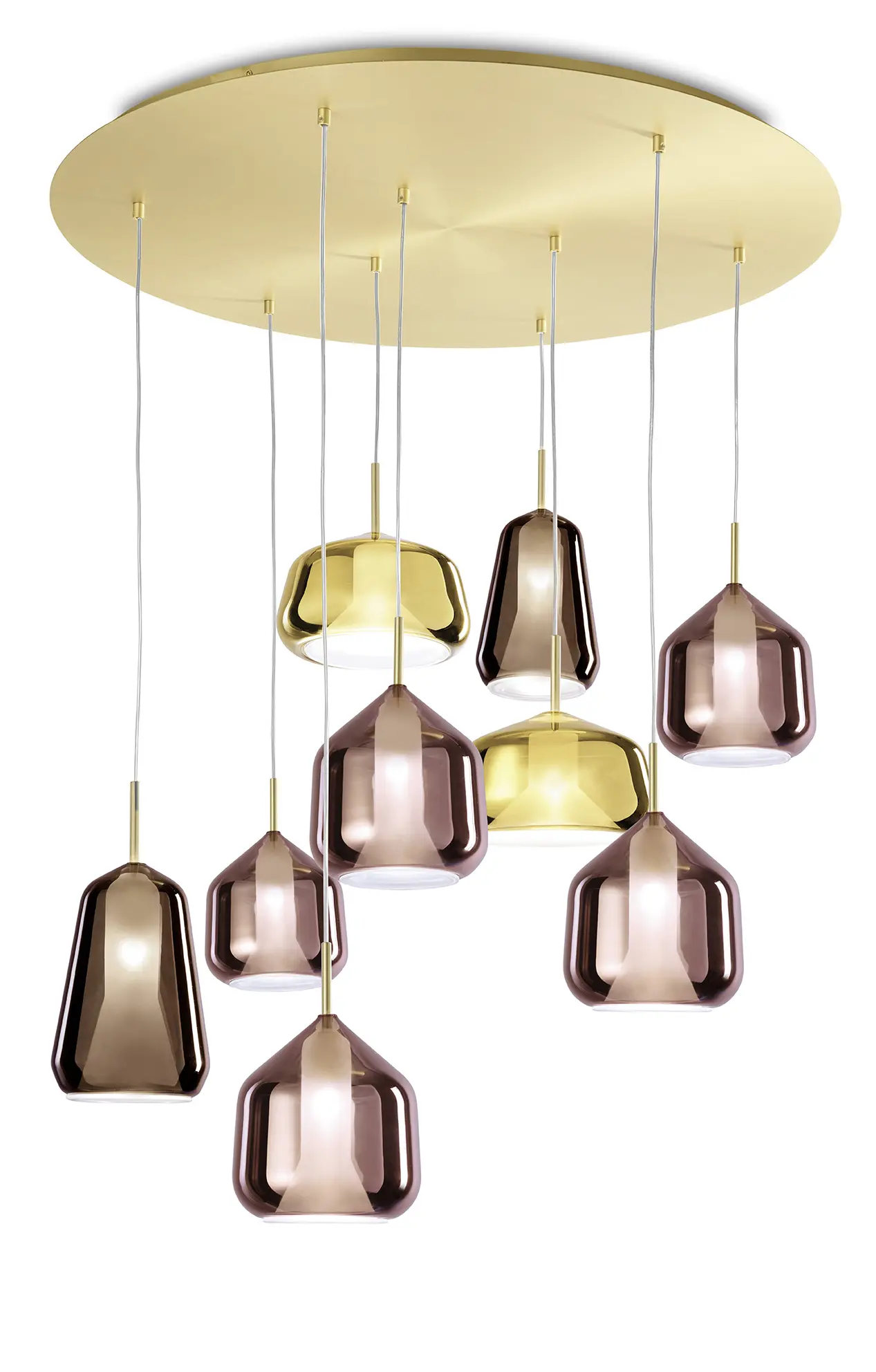 Lampada a sospensione composta da 9 luci in vetro Pire. Colori 2 Oro, 5 Rame e 2 Bronzo. Rosone e dettagli in oro spazzolato. Lampadine installabili G9 LED