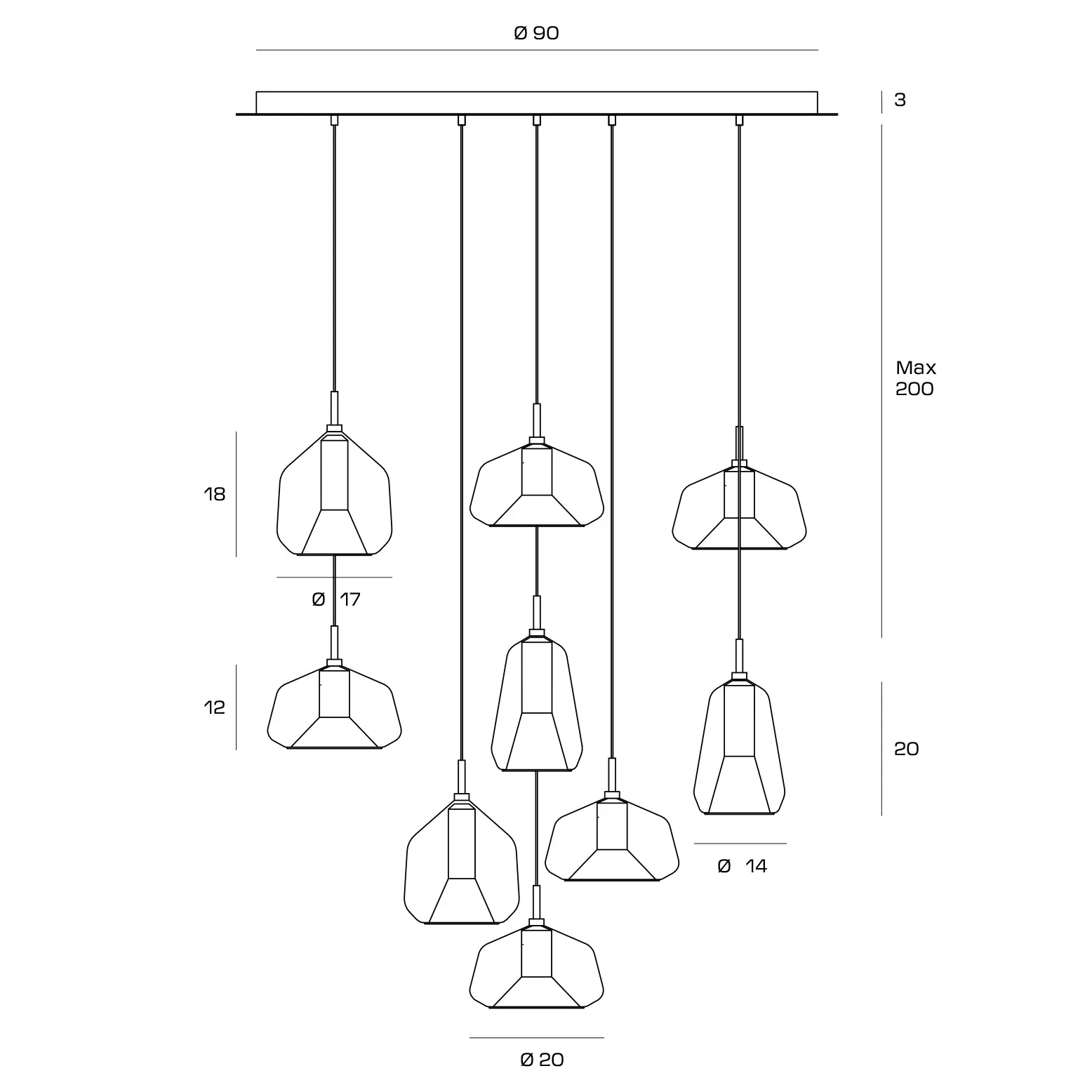 Sforzin Miloox – X-ray lampada a sospensione nove luci vetri 2 bronzo, 5 rame, 2 oro