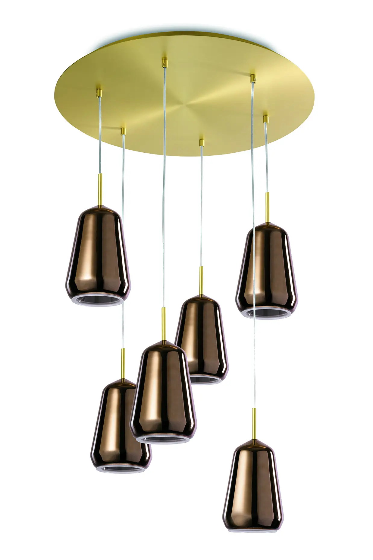 Lampada a sospensione composta da 6 luci in vetro Pirex nel colore Bronzo. Rosone e dettagli in oro spazzolato. Lampadine installabili G9 LED